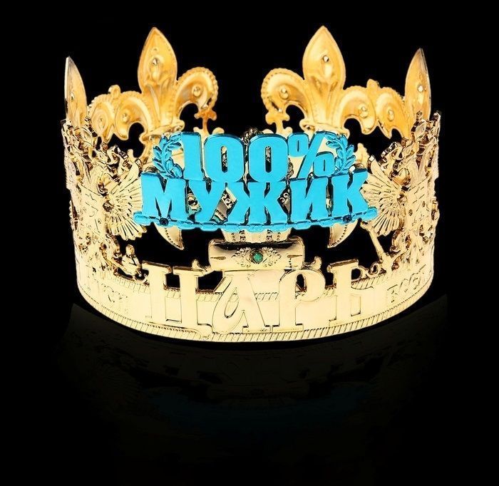 Золотистая корона с яркой голубой надписью "100% МУЖИК". Корона станет отличным подарком для вашего любимого мужчины на День рождения или 23 февраля и поднимет его самооценку. Корона сделана из пластика и имеет размер 11,6х60 см.
