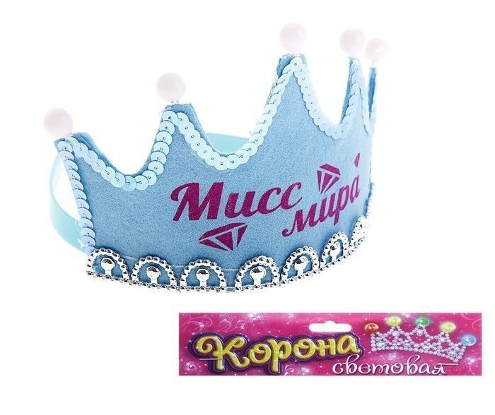 Голубая корона с подсветкой и надписью "Мисс Мира". Корона декорирована пайетками сверху и серебристой каймой снизу. Корона подойдет в качестве награждения на различных мероприятиях и принесет ее обладательнице приятные минуты славы и восхищения окружающих.