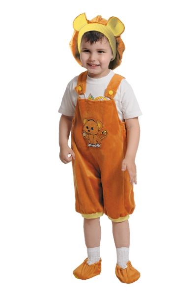 В комплект карнавального костюма озорного львенка входит комбинезон, накладки на обувь и шапочка.