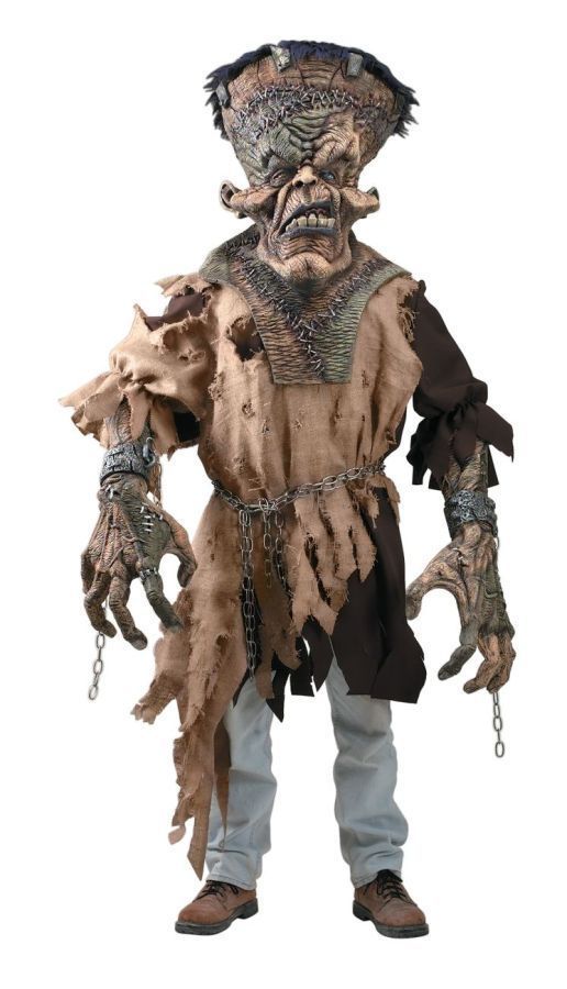 Костюм большеголового Монстра включает в себя огромную латексную маску с жуткой мордой, огромные латексные руки, а также мешковатую разорванную тунику и цепь на пояс. Этот костюм подойдёт для маскарадов, Хэллоуина, Пятницы 13 и подобных праздников.