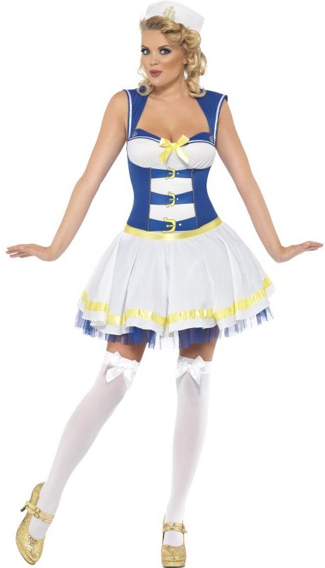 Костюм девушки матроса включает в себя платье и шляпу. Отличный выбор образа подруги настоящего морского волка.