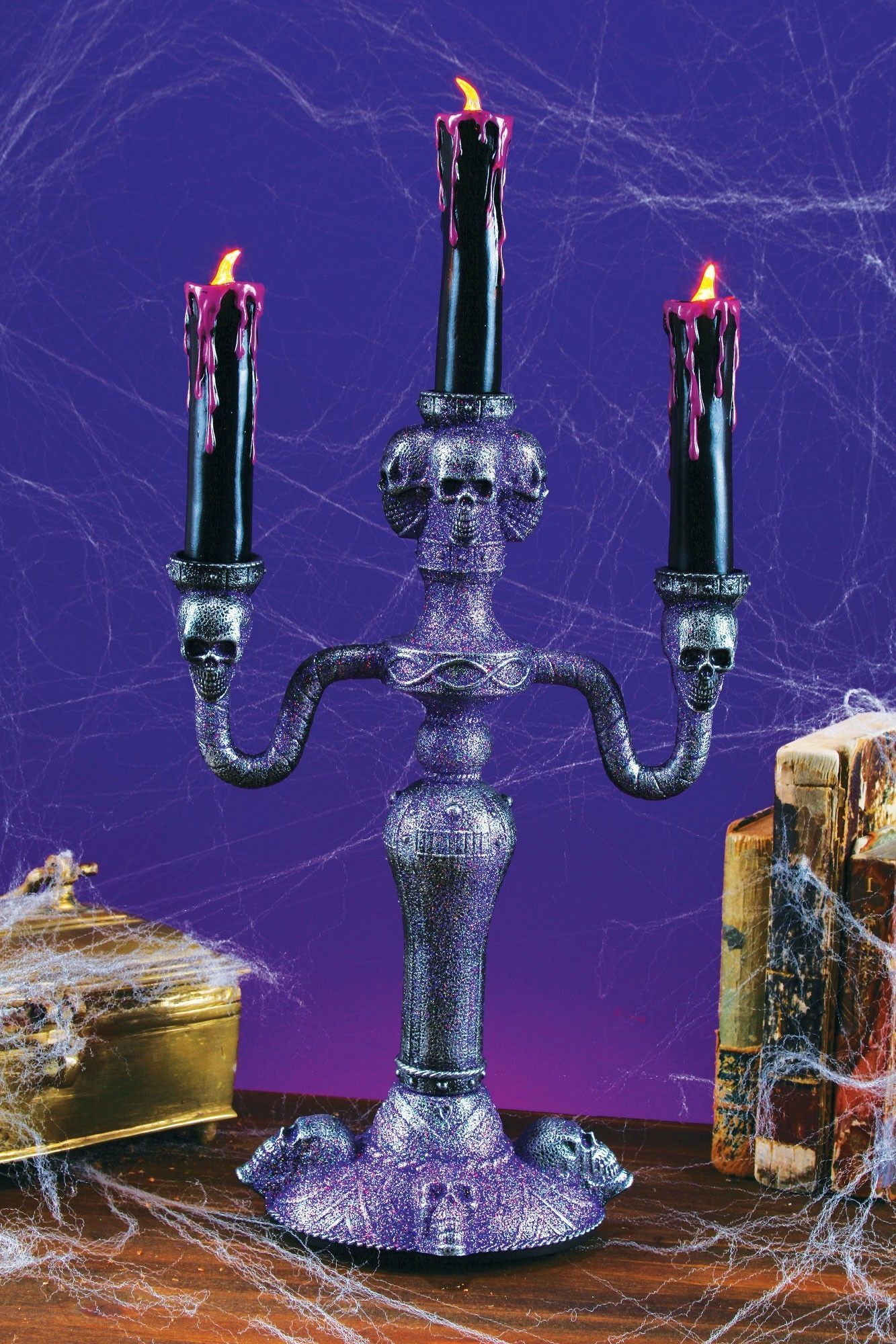 Блестящий фиолетовый канделябр с черепами - идеальная декорация на Хэллоуин. Канделябр выполнен в фиолетовом цвете и покрыт блестками. В канделябре установлено три светодиодные свечи черного света, лампочки которых выполнены в виде огонька. По свечам стекает воск фиолетового цвета.