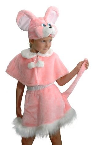 Костюм мышки сшит из ткани нежно розового цвета. Юбочка с белыми оборками и как у всякой уважающей себя мышки естественно с хвостиком. Пелерина с белым воротничком и завязками. Маска-шапочка с ушками торчком.