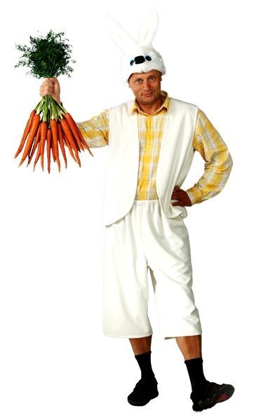 Мужской костюм Зайца выполнен в белом цвете. В костюм входят бриджи на резинке, жилет без пуговиц и головной убор с милой мордочкой зайчика и ушками. Этот милый костюм на взрослом мужчине будет смотреться очень забавно.