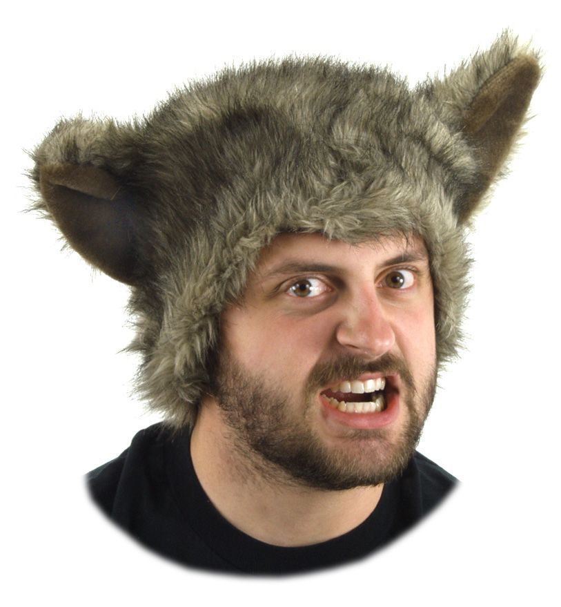 Меховая шапка оборотня выполнена из искусственного меха серо-коричневого цвета. На шапке имеются уши. Такая шапка прекрасно дополнит костюм оборотня и подобный образ.