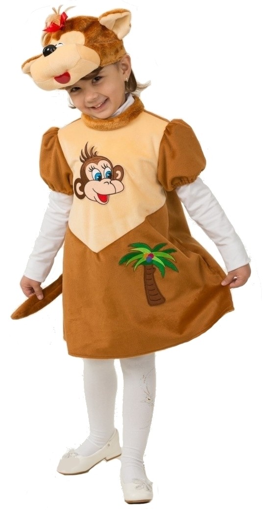 Детский плюшевый костюм обезьянки - костюм для девочек, выполненный из мягкого плюшевого материала коричневого цвета. В комплект входит платье со слегка расклешенной юбочкой, которое украшено пальмочкой и мордочкой обезьянки, а также в комплекте маска-шапочка, выполненная в виде мордочки обезьянки.
