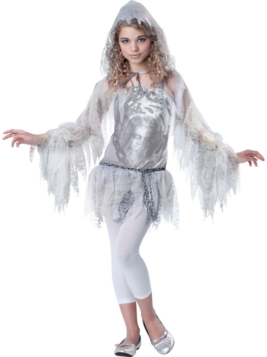 Костюм загадочного духа - это серебристое платье с изображением призрака, накидка с капюшоном, ремень-цепочка и леггинсы. В костюме загадочного призрака вы словно парите над землей, вы недосягаемая вершина для всех живущих на земле, вы удивительна и неповторима. К вашему образу будет приковано внимание всех участников маскарадной вечеринки.