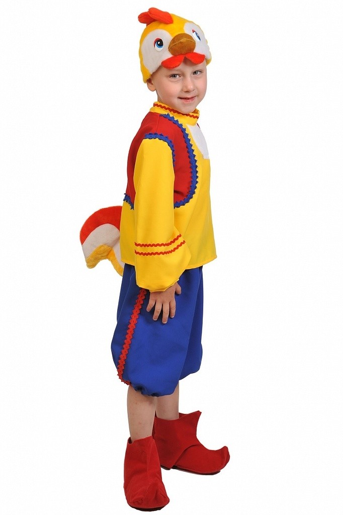 Маскарадный костюм Петушка - яркий разноцветный костюм, который включает в себя синие бриджи с красной полоской, желтую рубаху, красный короткий жилет с отделкой из синей тесьмы, красные мягкие сапожки, а также яркую маску-шапочку в виде мордочки Петушка.