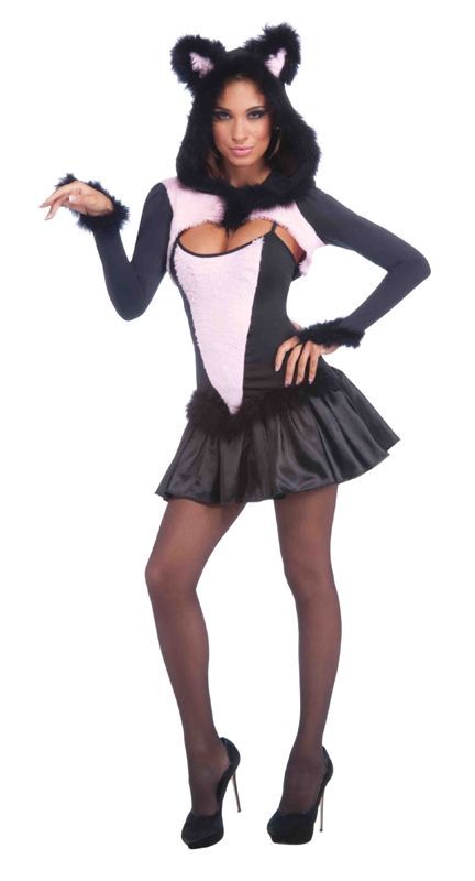 Костюм пушистой секси кошки включает в себя чёрно-розовое платье, балеро и ушки. В этом костюме вы можете отправиться на маскарад, карнавал и любые другие вечеринки.