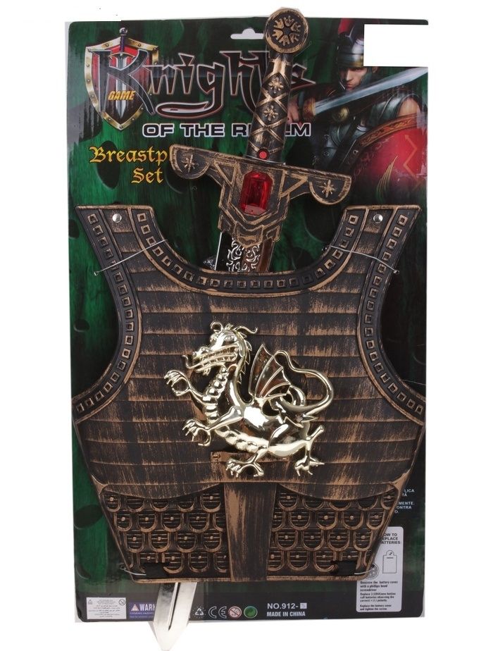 Набор смелого рыцаря включает в себя меч и щит. Меч работает от батареек и светится в темноте. Щит декорирован драконом. С такими оружием не страшно сразиться с самым грозным врагом и одержать над ним победу. Набор сделан из пластика.