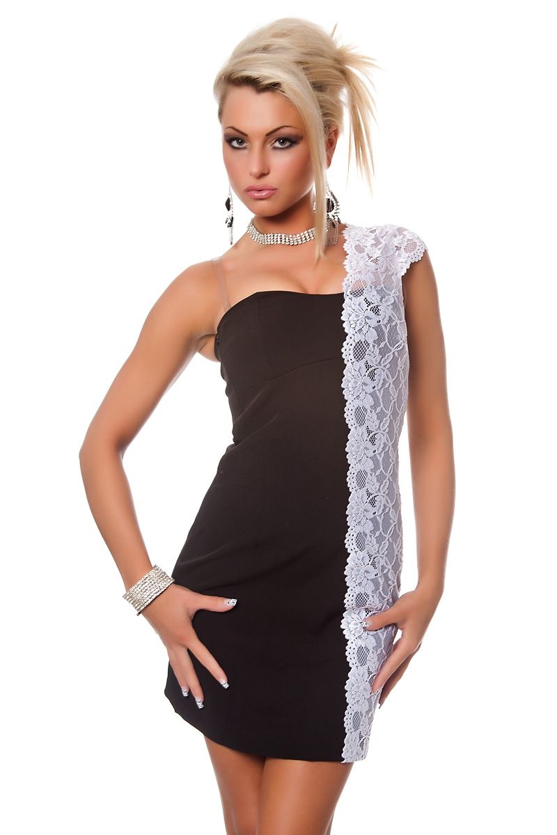 Короткое платье с белым кружевом выполнено в коричневом цвете. Одна сторона платья украшена белым ажурным кружевом, у платья также имеется один маленький рукавчик из этого белого кружева. Другое плечо полностью открыто. Это обтягивающее платье позволит вам создать очень соблазнительный образ.