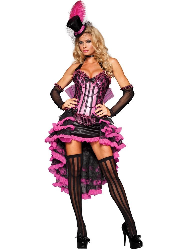 Костюм танцовщицы бурлеска включает в себя шикарное розово-черное платье с корсетом, который украшен черным кружевом и черным бантиком, также прилагаются сетчатые черные перчатки с розовыми рюшами и черная шляпка-цилиндр с розовым пером. Платье имеет пышную многослойную юбку с кружевом, которая сзади украшена большим черным атласными бантом.