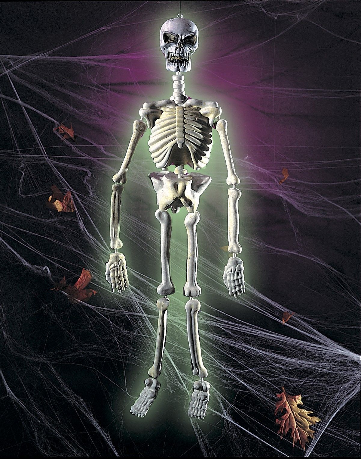 Светящийся в темноте скелет - это подвесная фигура скелета, выполненная в белом цвете. Размер этой фигуры около 90 см. Скелет светится в темноте. Такая фигура запросто сможет напугать неожиданного гостя!