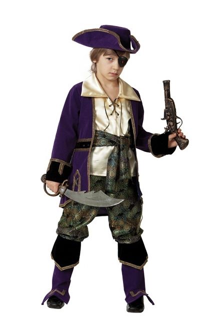 В Комплекте: камзол лиловый, рубаха, брюки с сапогами, пояс, повязка на глаз, треуголка, мушкет, сабля