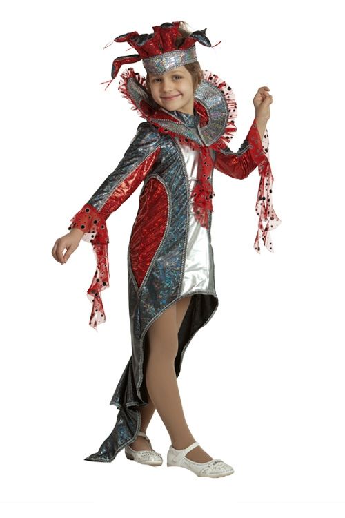 Детский костюм Красной Змейки включает в себя платье, выполненное в красных и серебряных цветах, с длинным шлейфом, воротник, а также головной убор в тон платью. Этот костюм непременно подойдёт для Новогодних утренников. Ваша девочка в нём будет выглядеть как настоящая Королевская Змейка.