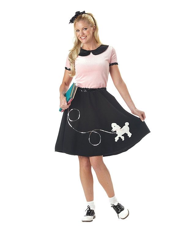 Костюм модницы 50-хх годов включает в себя розовый топ с черным воротничком, черную юбку до колен с изображением пуделя и черную в горошек повязку на голову. Такой костюм будет идеальным для ретро-вечеринок и вы сможете окунуться в прошлое.