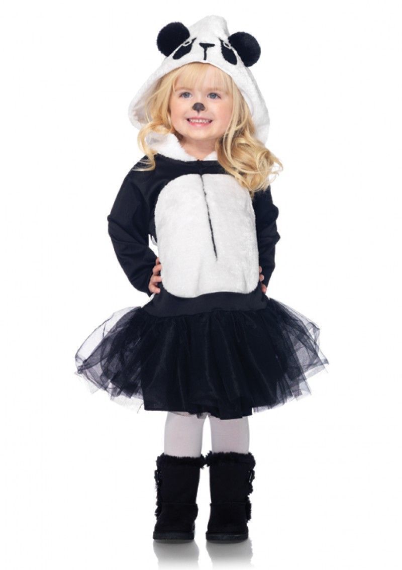 Костюм игривой панды - это детский черно-белый костюм, который представляет собой платье на молнии с пышной черной юбочкой из органзы и с капюшоном с мордочкой панды. Сзади имеется маленький хвостик.