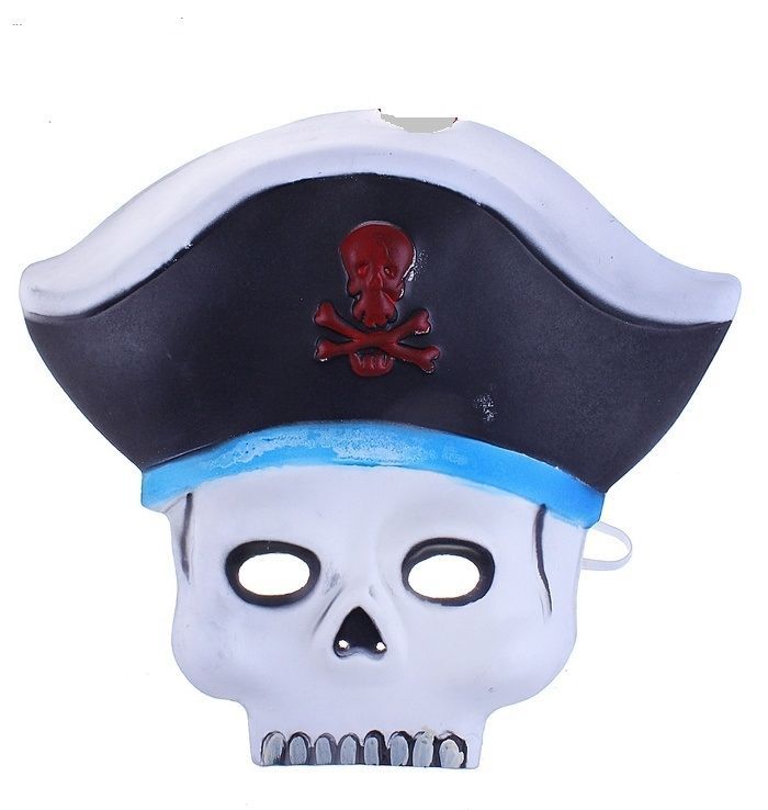 Маска пирата-страшилы в виде белого черепа с черным головным убором. Маска изготовлена из пластика и имеет размер 7х36х31 см. Также на нашем сайте вы можете приобрести костюмы и различные аксессуары для пиратских вечеринок.
