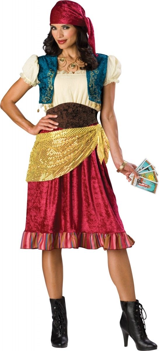 Милый, яркий наряд гармонично подчеркивающий природные дарования женщин. В костюм загадочной цыганки входят: платье, жилет, платок на пояс, ремень и головной убор.