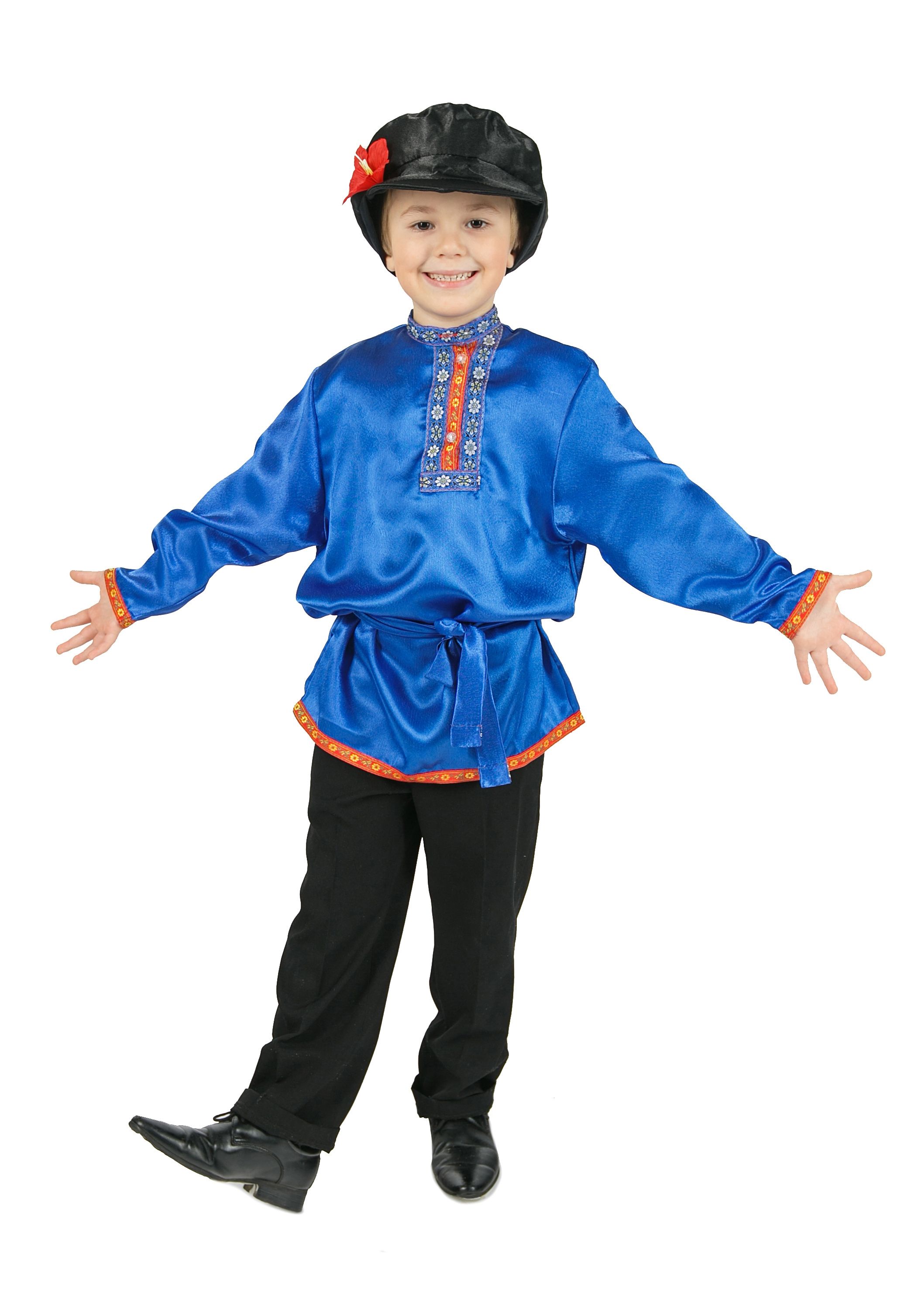 Косоворотка для детей синяя поможет создать настоящий русский народный образ. Косоворотка украшена тесьмой на манжетах, подоле и воротнике, также она подпоясывается атласным поясом.