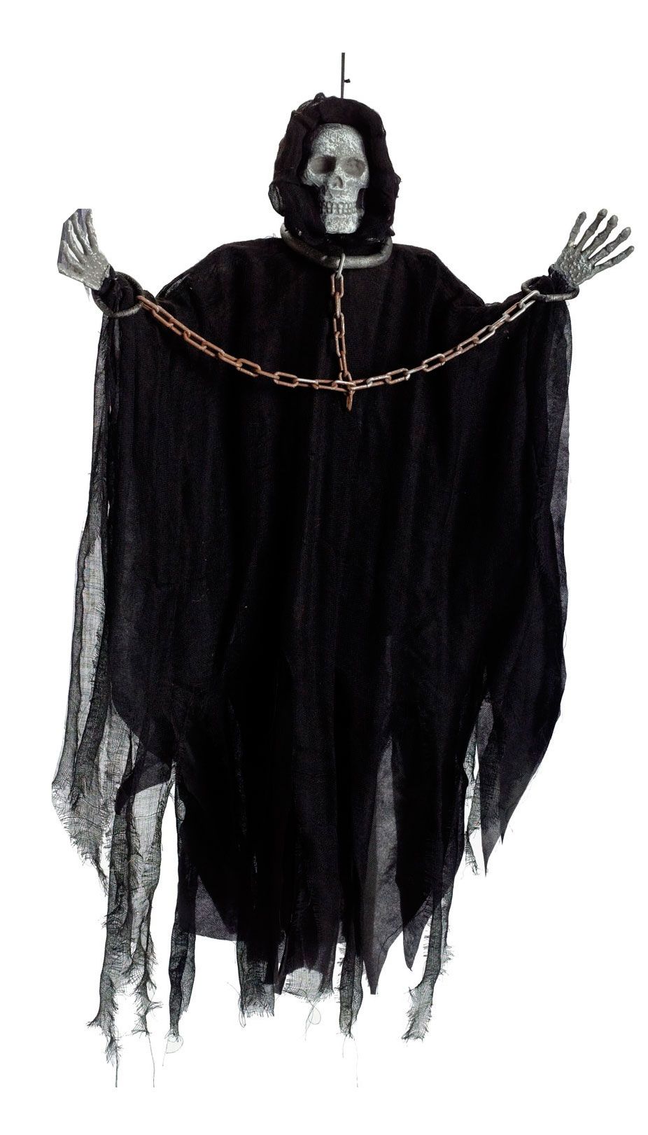 Подвесная фигура смерти высотой 90 сантиметров создаст отличную атмосферу вечеринки со страшной тематикой, а так же подходит для украшения дома. Для заказа имеются фигуры в виде: фигура в виде крика, фигура в виде смерти в черной мантии с цепями, фигура в виде ведьмы, фигура в виде тыквы.