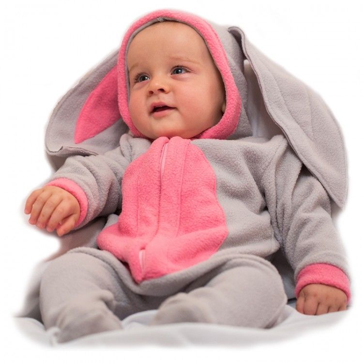 Костюм малыша Серого зайчика - это мягкий комбинезон из флиса, выполненный в сером цвете с розовыми животиком и розовыми вставками на ушках.
