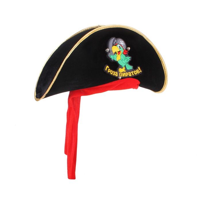 Детская шляпа Грозы пиратов - это черная шляпа с золотистой окантовкой, декорированная красной тканью в виде банданы и веселой нашивкой с изображением попугая и надписью "Гроза пиратов". Шляпа идеально подойдет для тематических мероприятий, утренников и вечеринок в пиратском стиле.