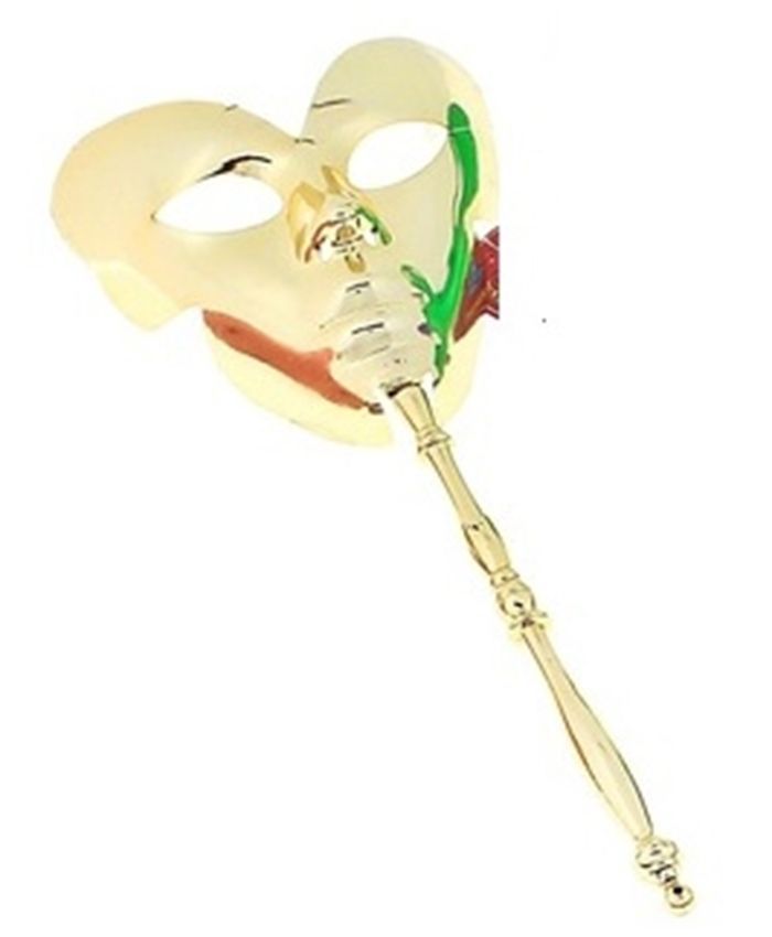 Маска на палке золотистая в виде лица дополнит любой карнавальный костюм и сделает ваш образ поистине королевским и незабываемым. Маска изготовлена из пластика и имеет размер 2х16х40 см. Маска станет отличным вариантом для карнавальных вечеринок, поможет вам скрыть свое лиц и сохранить тайну своего присутствия.