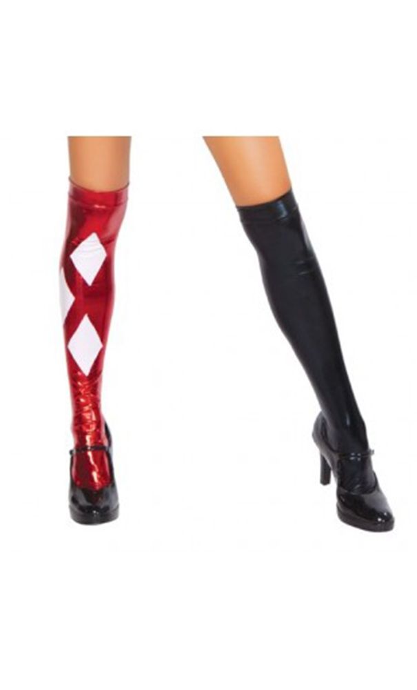 Чулки шута выполнены из блестящего материала. Один чулок выполнен полностью в черном цвете, а другой в красном, украшенный белыми ромбами. Чулки чуть выше колена.