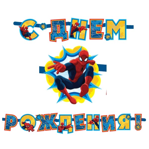Гирлянда С днем рождения Человек-Паук - яркая разноцветная гирлянда, выполненная в виде надписи: "С днем рождения!", дополнена изображениями Человека-паука.