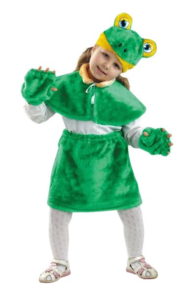 В костюм лягушки Ква входит юбочка, пелерина, забавная маска , перчатки имитирующие лапки лягушки.
