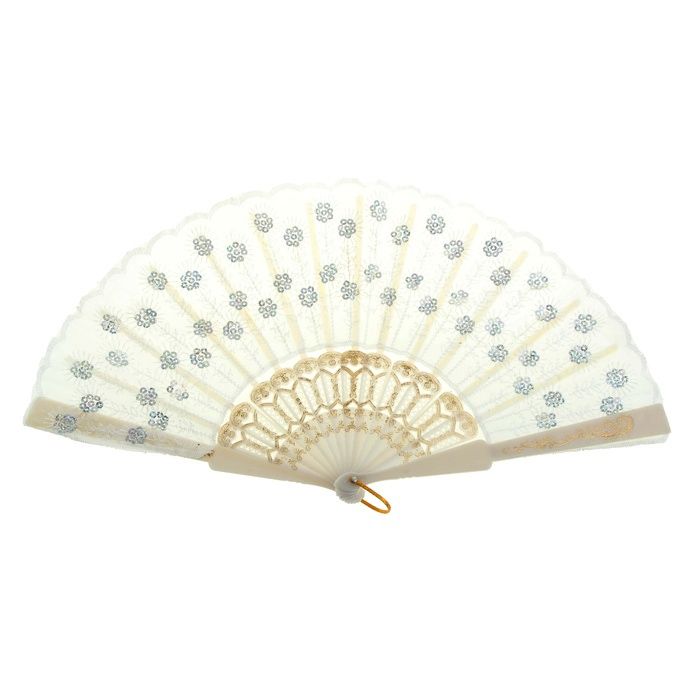 Белый веер с пайетками - это изящный легкий веер, выполненный в белом цвете и украшенный серебряными пайетками.