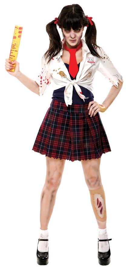 Костюм очаровательной школьницы зомби включает в себя платье с клетчатой юбкой, рубашку, красный галстук, накладные шрамы, кровавую линейку и грим. Добавьте аксессуары в свой костюм и вы получите прекрасный образ для Хэллоуина или Пятницы 13.