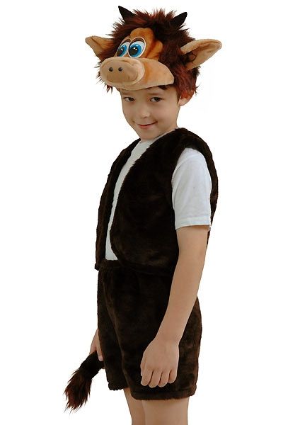 Шорты чертёнка выше колена. Черная бархатистая ткань жилетки, ушки, рожки маски-шапочки не дадут спутать этого персонажа ни с кем.