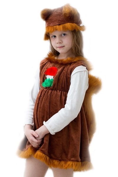 Костюм белочки для детей - коричневый костюм, выполненный из мягкого материала. В комплект входит свободное платье с меховой отделкой и пришитым пушистым хвостом. На платье имеется нашивка в виде грибочка. Также к платью прилагается шапочка с ушками и меховой отделкой.