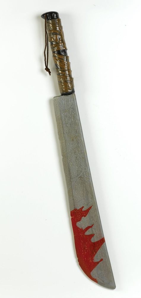 Кровавый мачете выполнен из прочного пластика. Рукоятка выполнена в коричневом цвете под дерево, к ней привязана веревка, само лезвие серого цвета с кровавым пятном в нижней части. Это оружие сможет прекрасно дополнить костюмы военных и воинов. Длина мачете около 80 см.