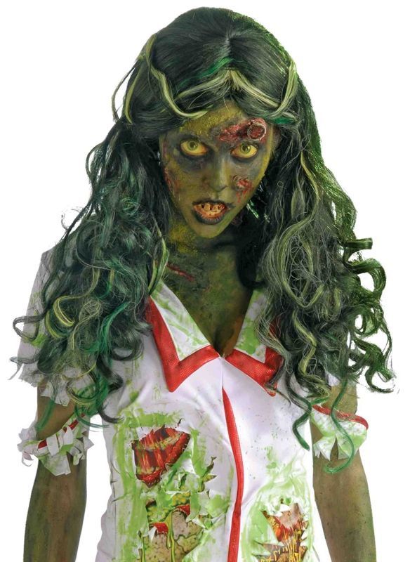 Парик зомби-фельдшера добавит в ваш костюм нежити идеальный штрих. Этот парик выглядит так, будто волосы могли быть роскошными и здоровыми. Но их цвет говорит о том, что их владелица больной зомби. Парик выполнен в различных оттенках зелёного цвета, а также в серых цветах, что придают парику больного зомби впечатляющий и жуткий вид.