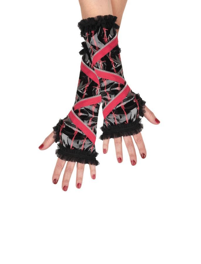 Детские перчатки с молнией прекрасно дополнят рокерские костюмы детей и подобные образы. Перчатки выполнены в чёрном цвете украшены односторонней красной молнией.