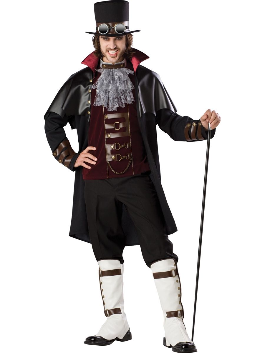 Шикарный костюм вампира-стимпанка станет отличным выбором для Хэллоуина или пятницы 13. Костюм включает в себя: черный плащ со стойкой-воротником бордового цвета, к которому прикреплена накидка с заклепками; бордового цвета жилет, декорированный коричневыми ремешками и белым кружевным жабо; шляпа-цилиндр, с коричневой лентой; специальные накладки на обувь, имитирующие белые сапоги с ремешками и очки. Брюки и трость в комплект не входят. Для своей спутницы вы можете приобрести на нашем сайте костюм вампира-стимпанка женский и стать самой лучшей парой вечера.