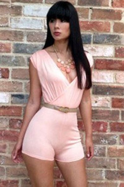 Розовый комбинезон с отличным декольте изготовлен из высококачественной эластичной ткани. Хороший выбор для теплого времени года.