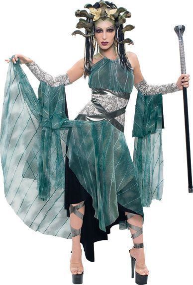Костюм властной медузы включает в себя шикарное платье цвета морской волны, нарукавники, повязки на ноги. Такой прекрасный костюм подойдёт для вечеринок в мифическом стиле, выступлений и маскарадов.