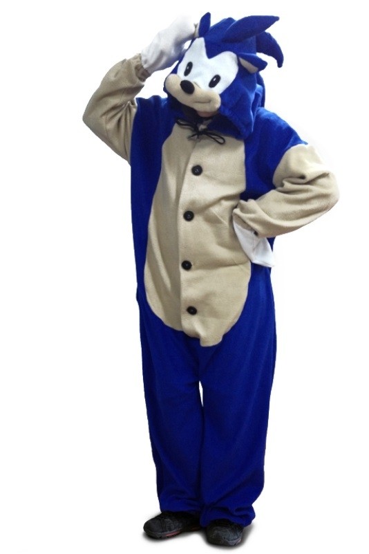 Кигуруми Супер Соника - флисовый мягкий костюм, выполненный в сине-серых цветах. Костюм на черных пуговицах спереди. Капюшон выполнен в виде мордочки Соника из известной видеоигры. К капюшону крепятся затяжные шнурки, к рукавам съемные белые перчатки.