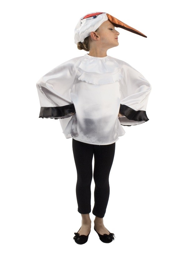 Детский костюм Аиста подойдет как для мальчиков, так и для девочек. Костюм включает в себя белую рубашку с рукавами-крыльями с черной отделкой, а также маску-шапочку с длинным клювом.