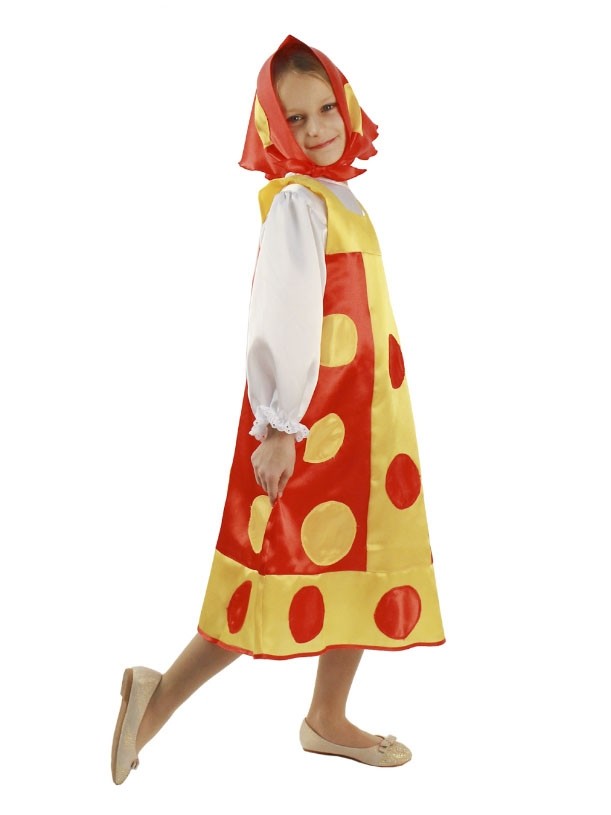 Детский костюм Матрешки - яркий костюм, который выполнен по мотивам русского народного сувенира. В комплект русского костюма матрешки входит двухцветный сарафан в крупный горох, яркая атласная косынка с горошинами, а также белая рубашка с кружевными рукавами и кружевным воротничком.