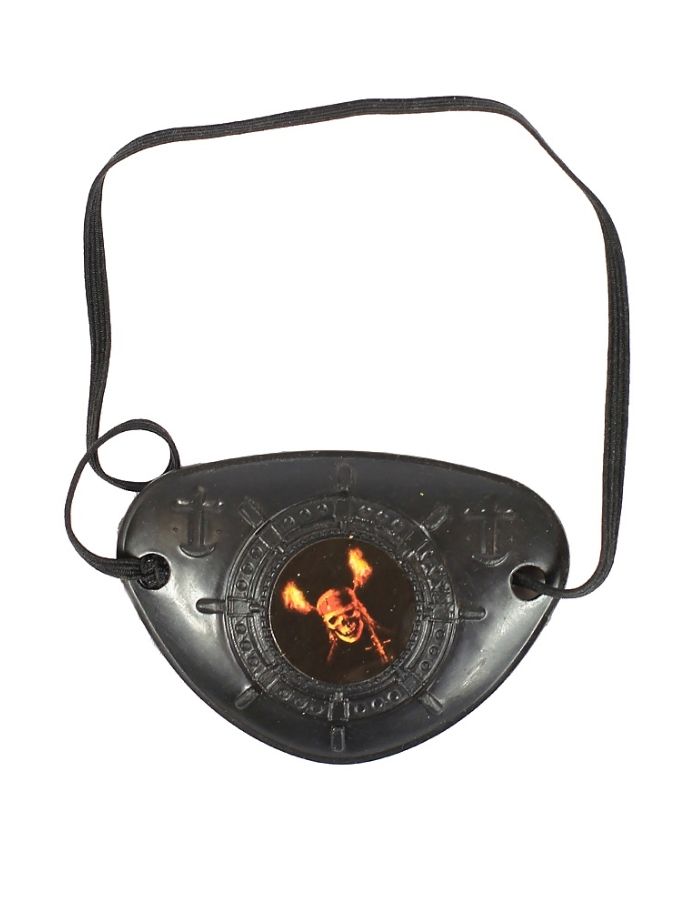 Пластиковая пиратская повязка на глаз выполнена в черном цвете. Повязка крепится при помощи резинки. Ее украшает разноцветный рисунок черепа с огнем.