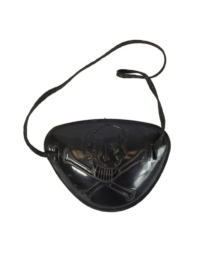 Пиратская повязка на глаз выполнена из пластика черного цвета. Крепится при помощи резинки. На повязке имеется эмблема черепа и костей.