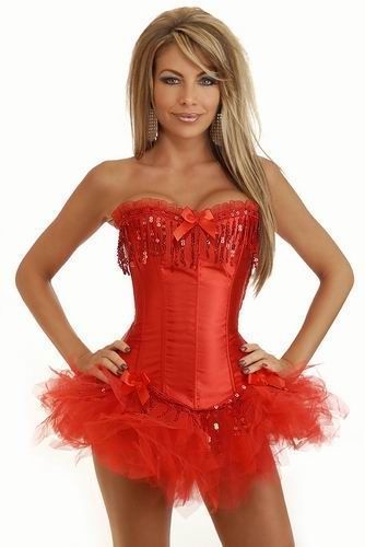 Красный корсет с пайетками и юбкой поможет создать вам яркий образ. Корсет сзади на шнуровке. В комплекте идут стринги.
