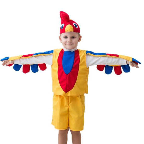 Детский костюм Яркого Петушка выполнен в желтом цвете с красными и синими вставками. В комплекте имеются шорты, безрукавка с пришитыми крыльями, а также красная шапочка-маска с клювом, гребешком и глазками.