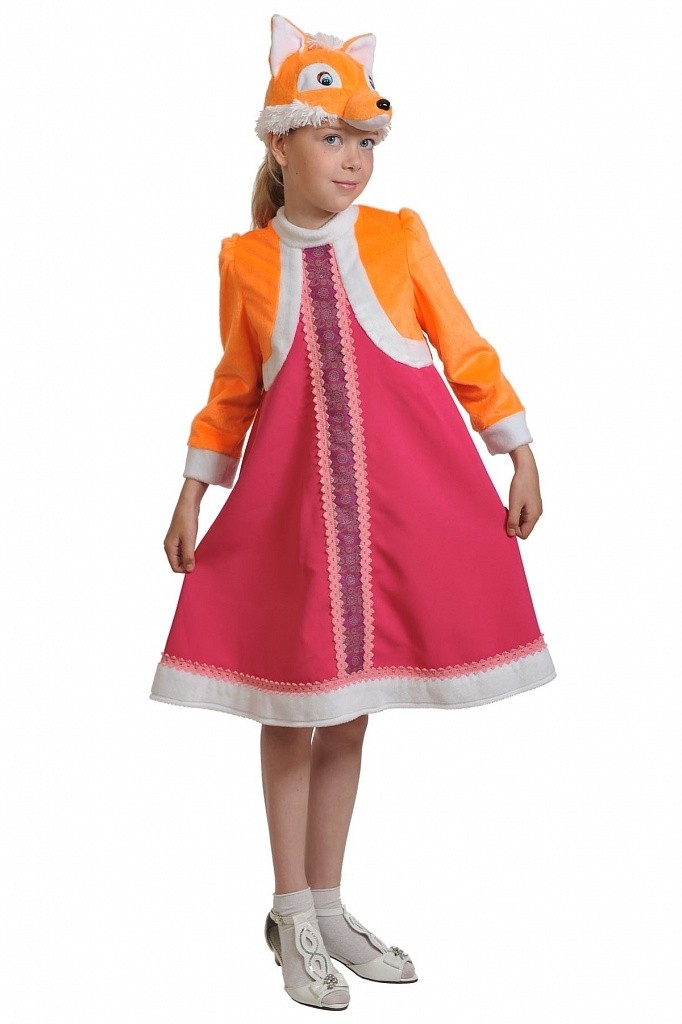 Маскарадный костюм Лисы Патрикеевны - отличный выбор для постановки детского спектакля. В комплект входит яркое платье чуть ниже колена, украшенное узорчатой тесьмой, оранжевая мягкая шубка и шапочка-маска в виде мордочки лисицы.