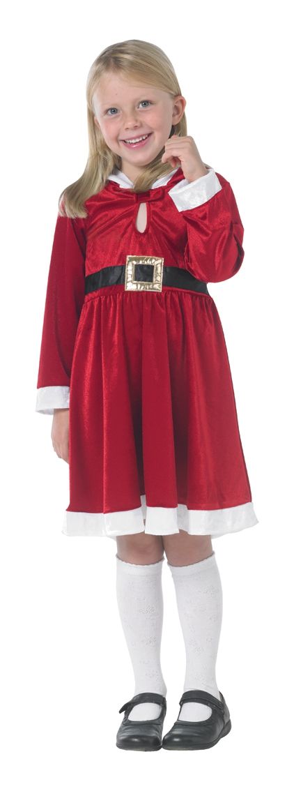 Детский костюм мисс Санты - это красное платье до колен с длинными рукавами с белой отделкой и черными поясом с бляшкой. Этот костюм ваша девочка может надеть на новогодний утренник и для домашнего праздника.